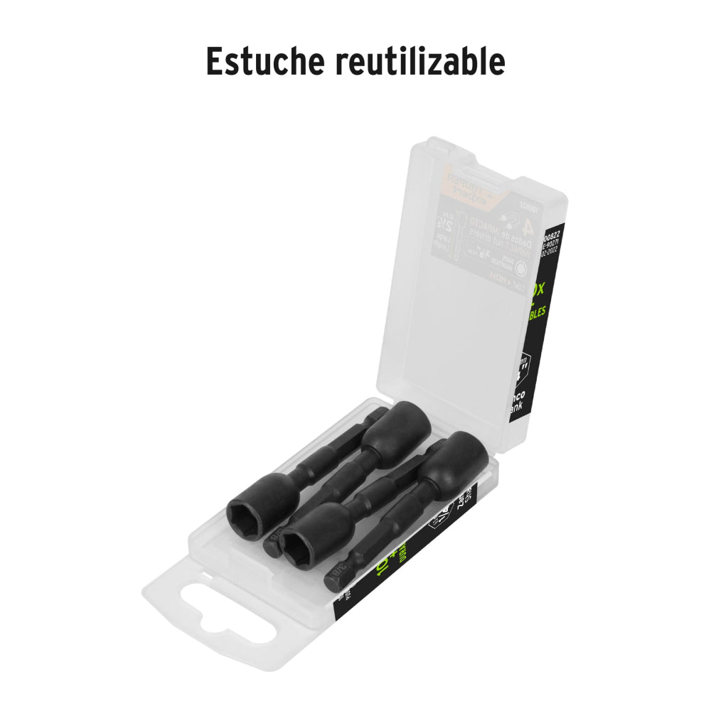 Dados magnéticos de impacto fabricados en acero S2, ofreciendo el doble de resistencia al desgarre comparado con acero al cromo tradicional. Su acabado en óxido negro proporciona protección duradera contra la corrosión en ambientes exigentes. Equipados con potente imán integrado que asegura la tornillería sin deslizamientos durante el trabajo. Maquinado de precisión garantiza encaje perfecto en tu máquina eléctrica. Entrada de 3/8" compatible con herramientas estándar. La solución confiable para profesionales que demandan rendimiento y durabilidad en cada aplicación.