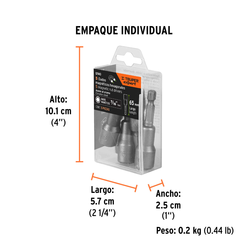 | 12943 | PUDE-9087 | 5 dados | 7/16" (11 mm) | 2 1/2" (65 mm) | 1/4" (6.5 mm) | Estuche | 4320 |