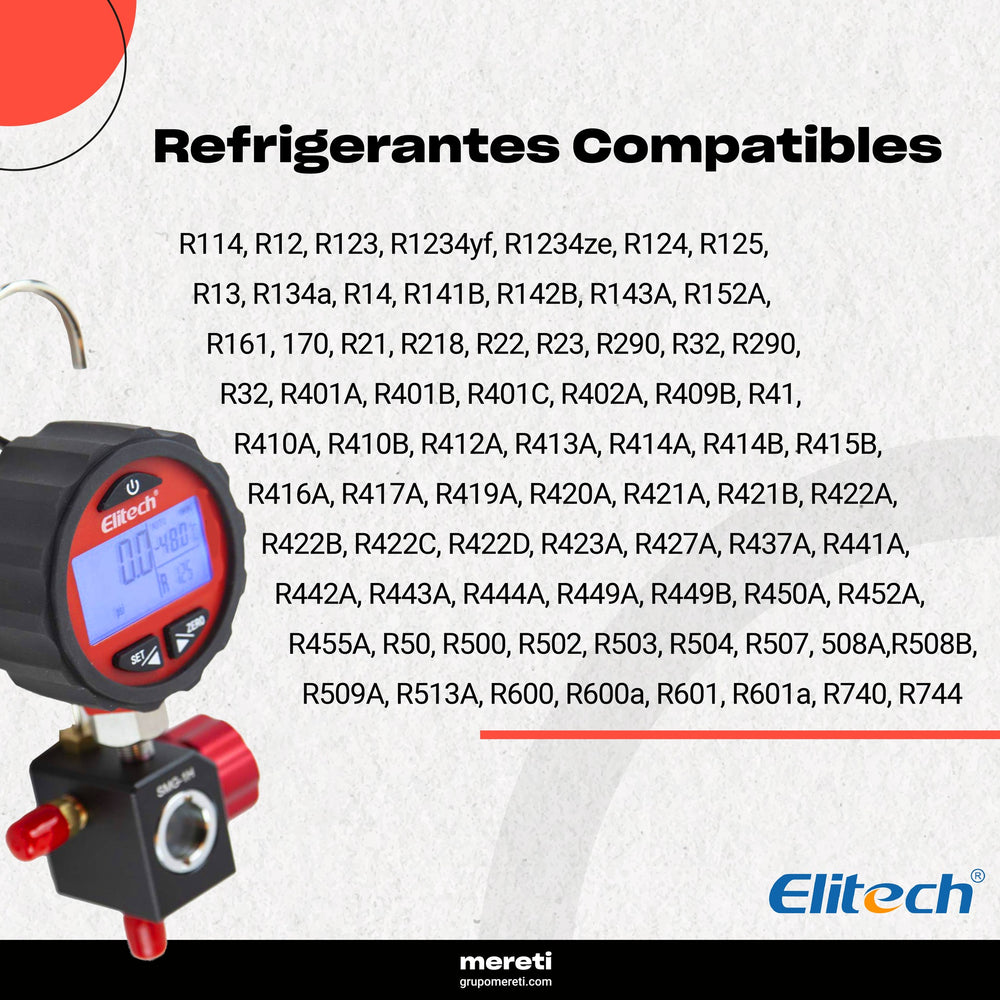 ¡Optimice su sistema de refrigeración con el manómetro digital Elitech! Mantenga y monitoree su equipo con este profesional manómetro digital de alta. Fácil de usar y preciso, le permite mantener cargas de refrigerante y asegurar un funcionamiento eficiente. ¡Haga que su sistema funcione al máximo con el manómetro digital Elitech!